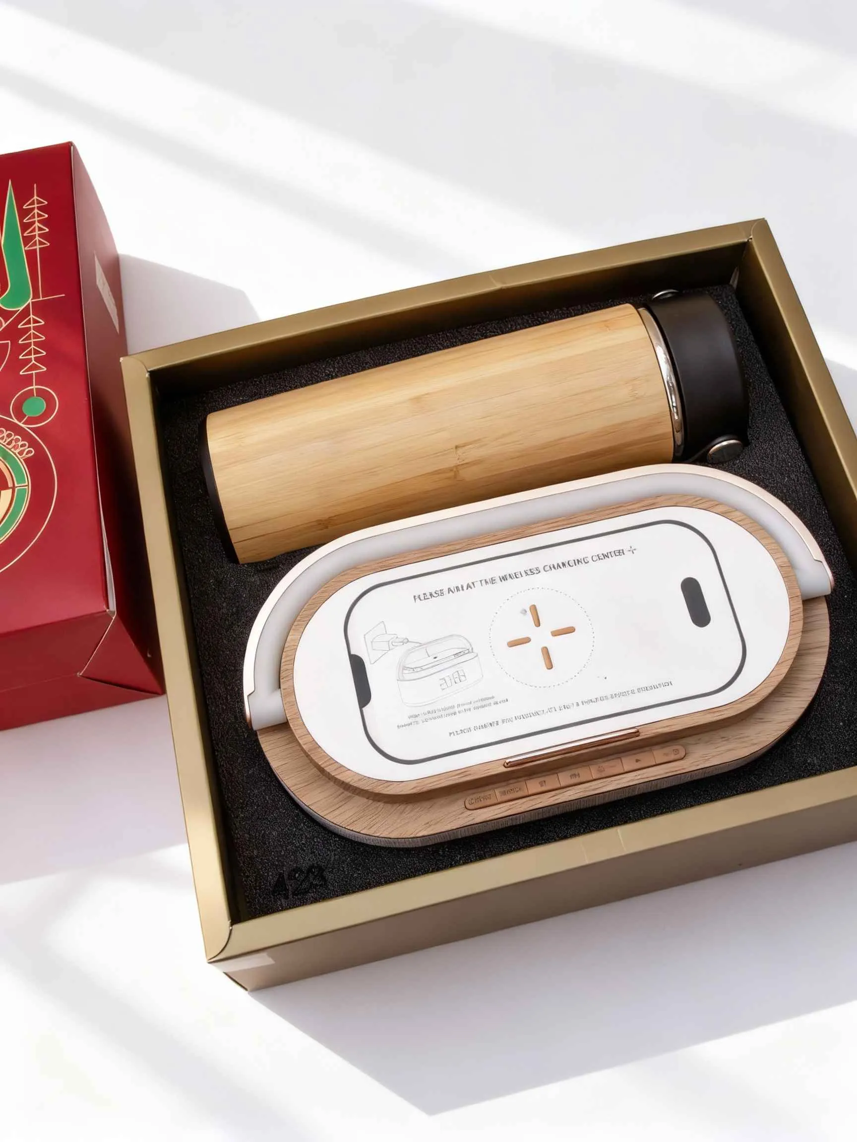 این هدیه نه فقط یک محصول، بلکه تجربه ای چند حسی است. صدای گرم اسپیکر، نور آرامش بخش چراغ مطالعه و گرمای نوشیدنی در تراول ماگ چوبی، ترکیبی از آرامش و لذت ایجاد میکند. پک یلدایی سازمانی در این قالب تجربه ای کامل از حس و زیبایی است.