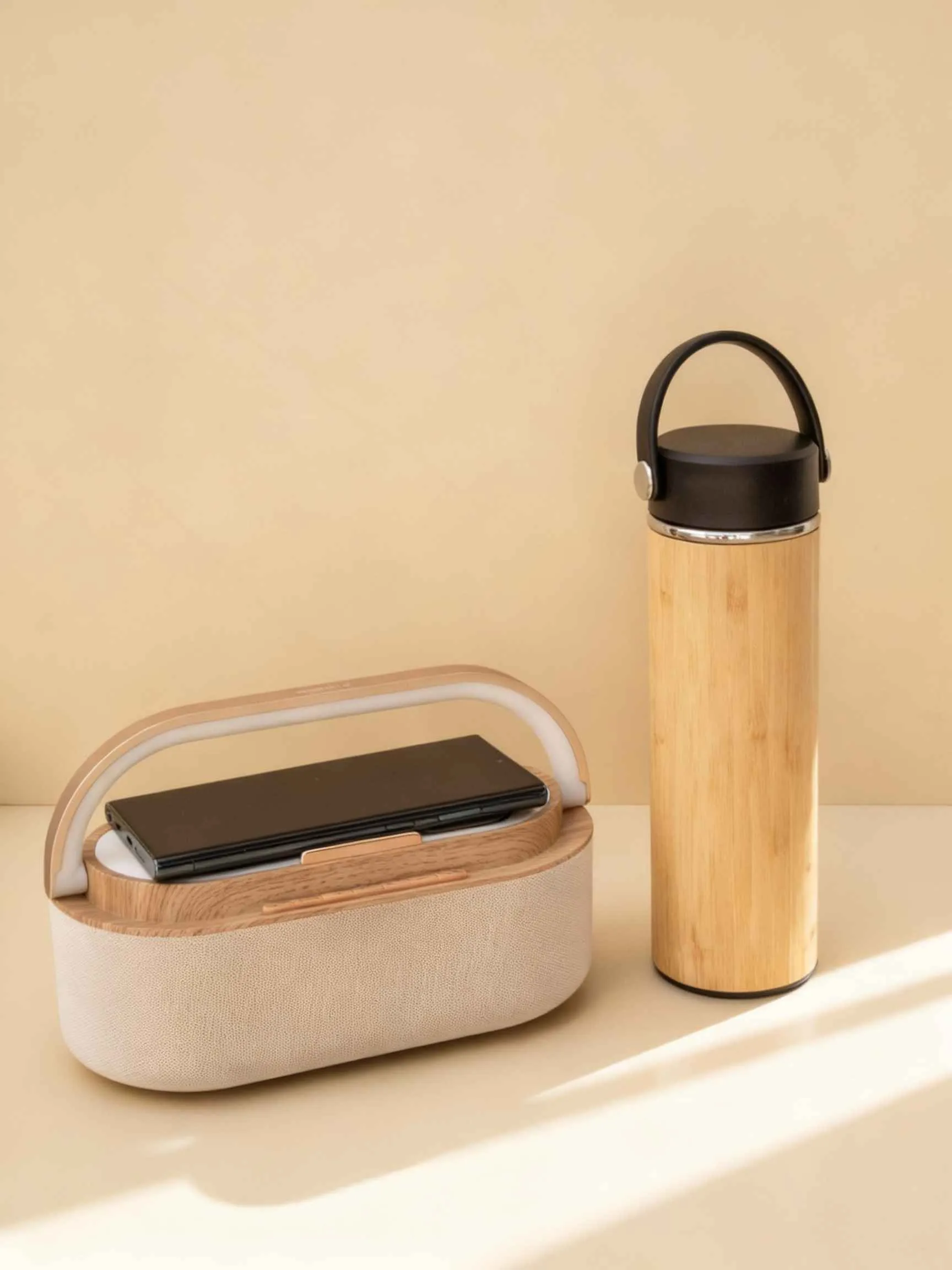 اسپیکر پرتابل بلوتوث و تراول ماگ چوبی در پک یلدایی سازمانی بنتا فلاور نمادی از تلفیق فناوری روز با طراحی اصیل هستند. این ترکیب هدیه شب یلدا را به نمونه ای بی نظیر از کارایی و هنر تبدیل میکند.