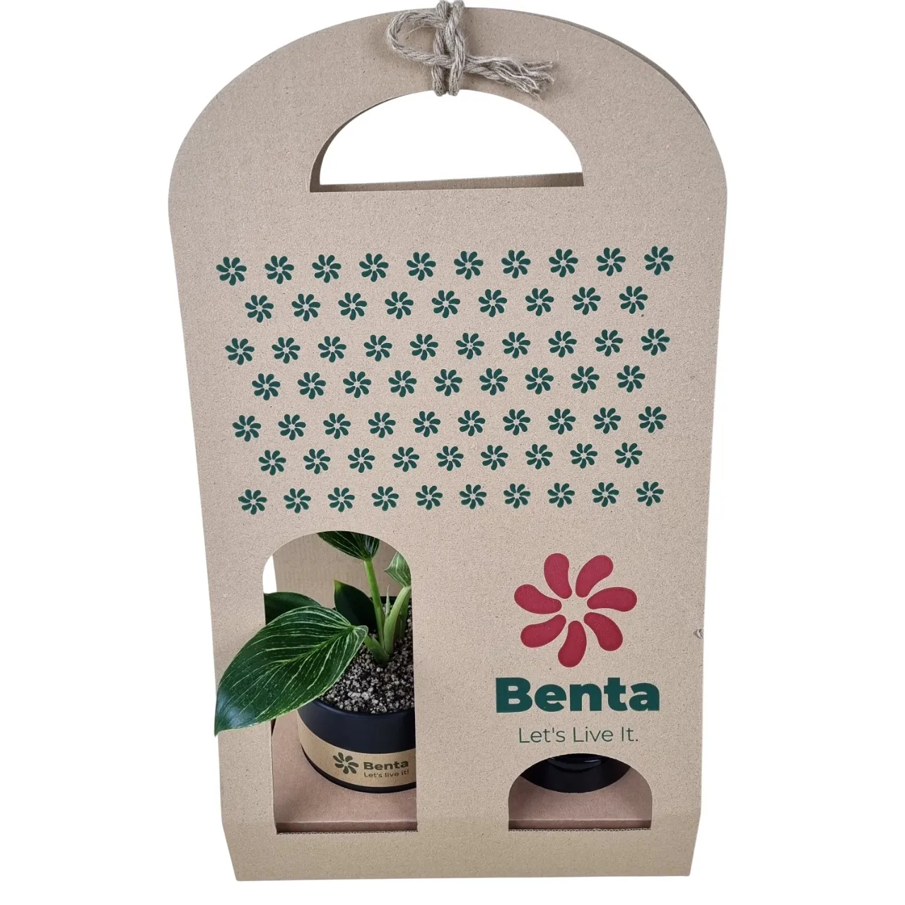 پک هدیه شرکتی بنتا مجموعه ای لوکس و هوشمندانه است که با هدف ارتقای تجربه هدیه دادن سازمانی طراحی شده است. وجود گیاه فیلودندرون برکین در این پک پیام آرامش، رشد و توجه به جزئیات را منتقل می کند و کنار آن ماگ دست ساز به ارزش هدیه عمق و هویت می بخشد.